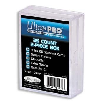 Ultra clear, heavy-duty boxes have snug fitting semi air-tight closures. This 2-piece box holds up to 25 Standard Size cards. Square corners to help prevent damage to card corners. Stackable for easy organization and storage. 2 boxes per pack.